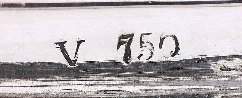 This piece is stamped 750 on the side of the base, for the purity of the silver. Next to the purity stamp is the letter V, possibly a maker's mark. The bobeches/wax drips as well as the socle insert of the removable arms are all stamped 750.