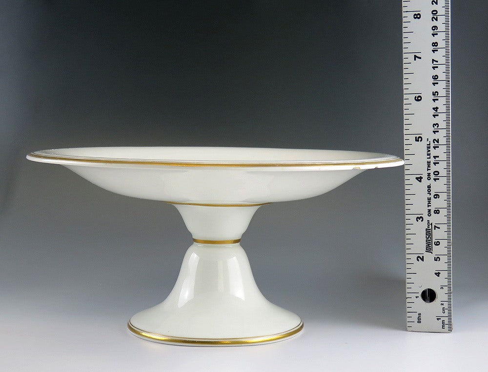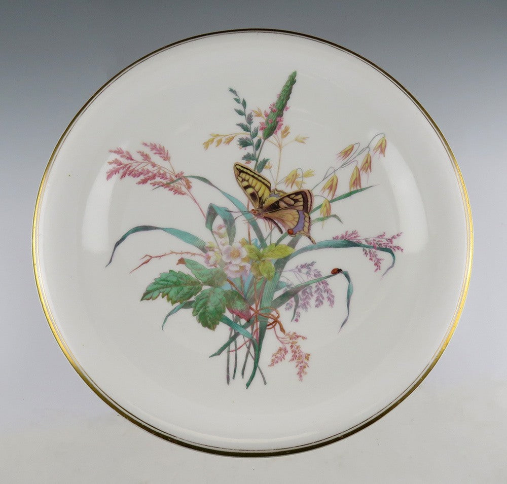 Presented is a lovely, gilded, creamy white antique dessert stand or pedestal compote produced in the middle to late 1800's by Copeland of England. The platter features a colorful arrangement of wildflowers and grasses where a large swallowtail butterfly and red ladybug light amidst the stems.
