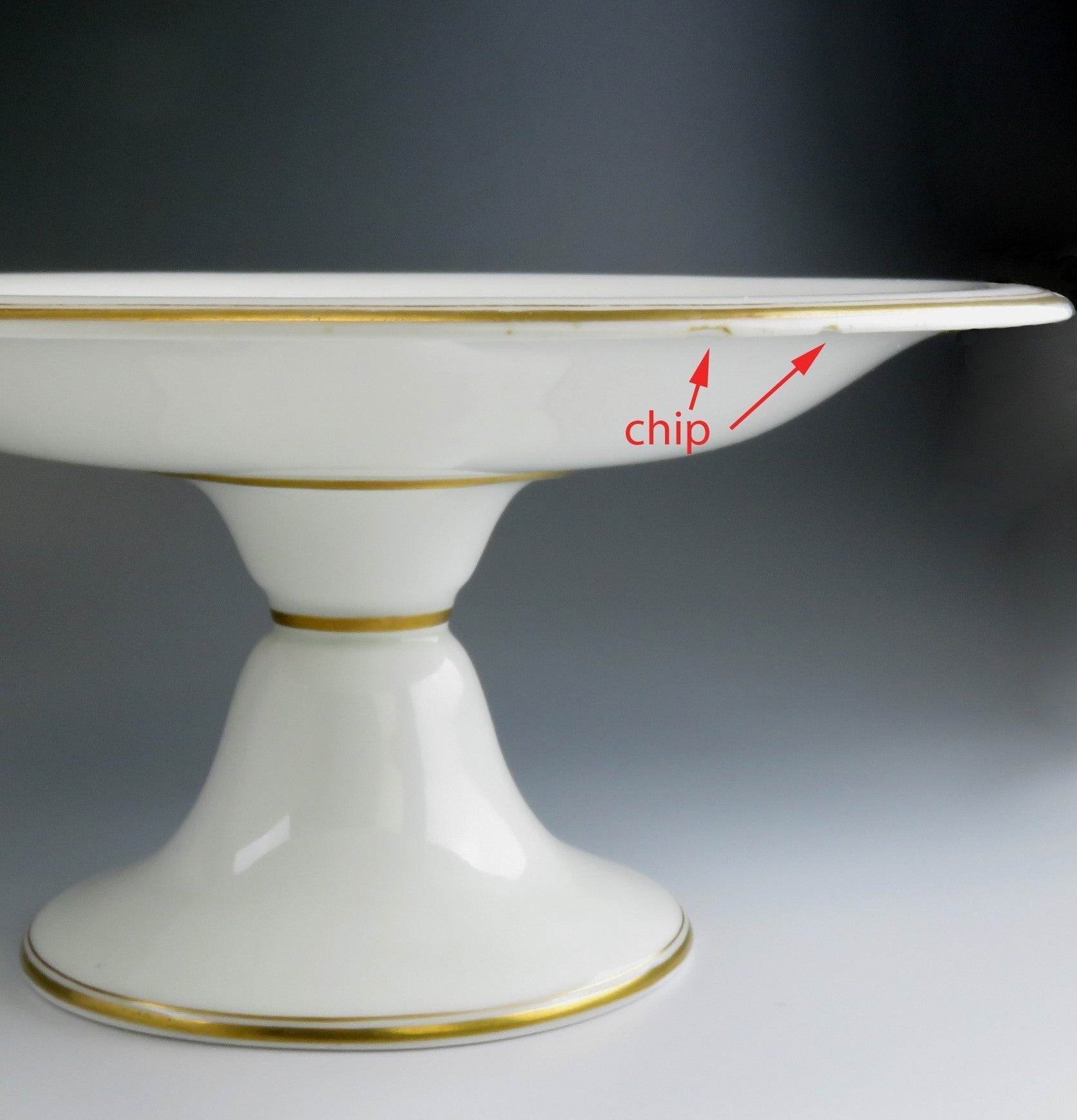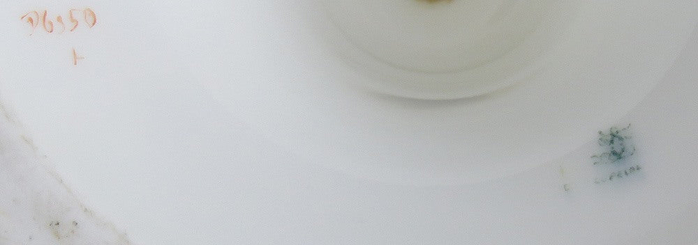 The condition of this antique is quite good for its age. The stand displays beautifully with some wear to the painted scene and gilded rim borders. There are no cracks anywhere, but there are two small chips in the underside of the rim, as we show you in our well-focused photos.