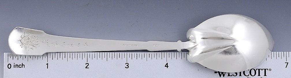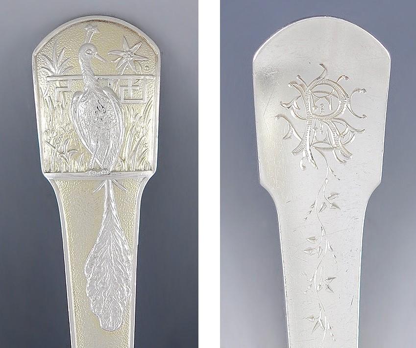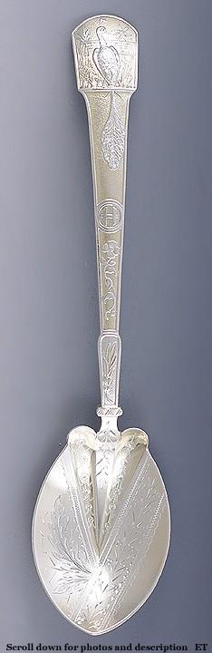 Presented is a lovely, sterling silver sugar, berry, ice cream or small serving spoon made by the Gorham Manufacturing Company during the late 19th century. This piece is in the Japanese pattern and was patented circa 1871. This piece is old, original production from the 1870s or 1880s. The handle is beautifully decorated with a raised peacock design and Japanese flowers. The bowl is hand engraved with bright cut designs. There is a pretty monogram on the back of the handle of the letters ESR. Much of the spoon has a slight gold wash.