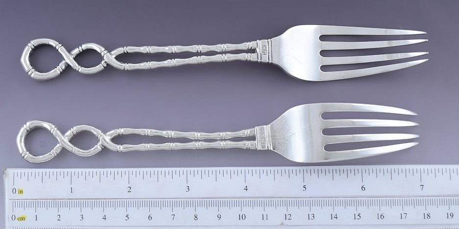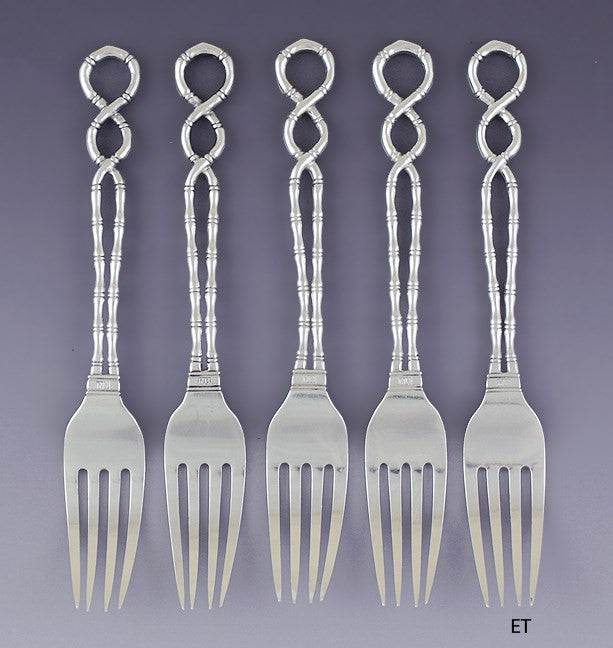Presented is a great set of 5 Chinese export silver forks. These forks date to around 1880-1900 and were made by Wang Hing, one of the most if not THE most renowned names in Chinese export silver. The forks are done in a bamboo design, with a double shaft that terminates in a twist design with bamboo leaves in the center.