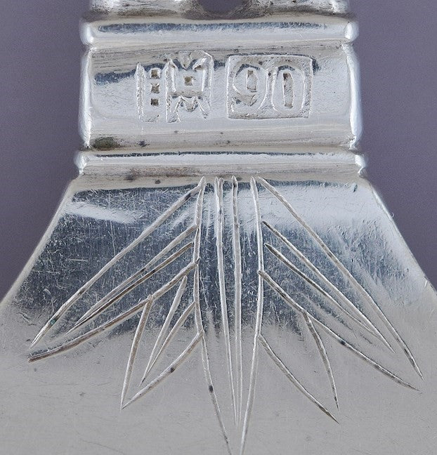 The forks are stamped with the maker's mark for Wang Hing as well as a Chinese character mark and 90 indicating a silver purity of 900.