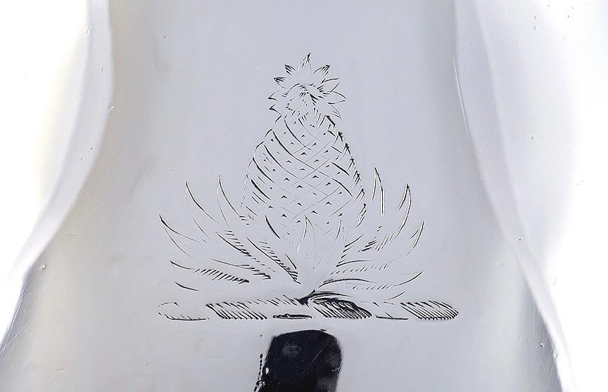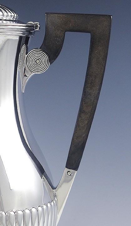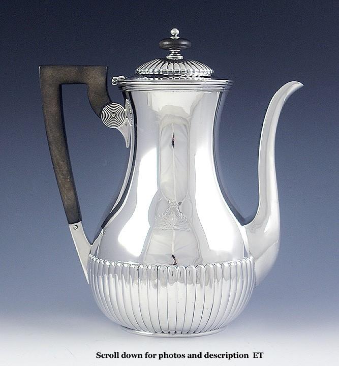 Presented is a fabulous quality American sterling silver coffee or tea pot. This piece was made by Bigelow, Kennard & Co, and dates to circa 1882. The pot is done in a lovely classical style, with a ribbed design on the lower part of the body. The handle and the finial of the lid are made from rich dark wood. The underside of the pot has a presentation that reads 'C.E. Perkins, Sept. 22, 1882.' One side of the pot has an interesting engraved crest of a pineapple amidst leaves or flames.