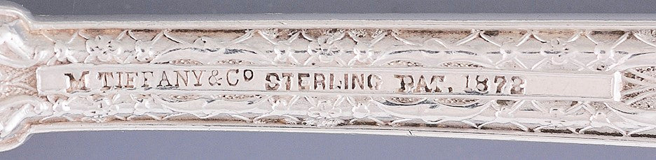 The stem of each piece is stamped 'sterling' and with the maker's mark for Tiffany & Co, as well as the initial M for the company director between c1872-1891, Edward Moore and the patent date for the pattern, 1872.