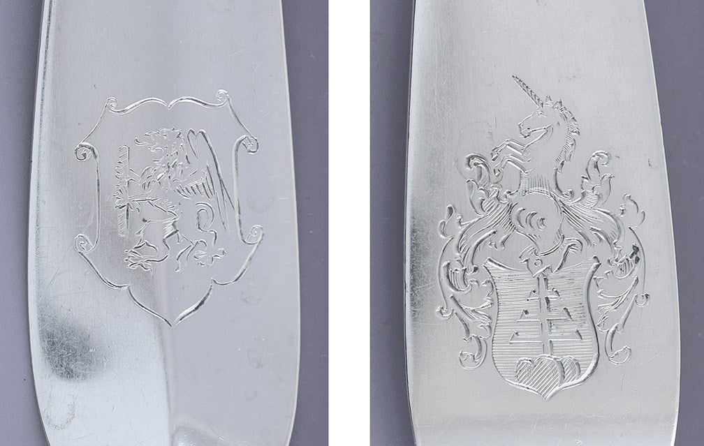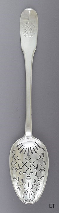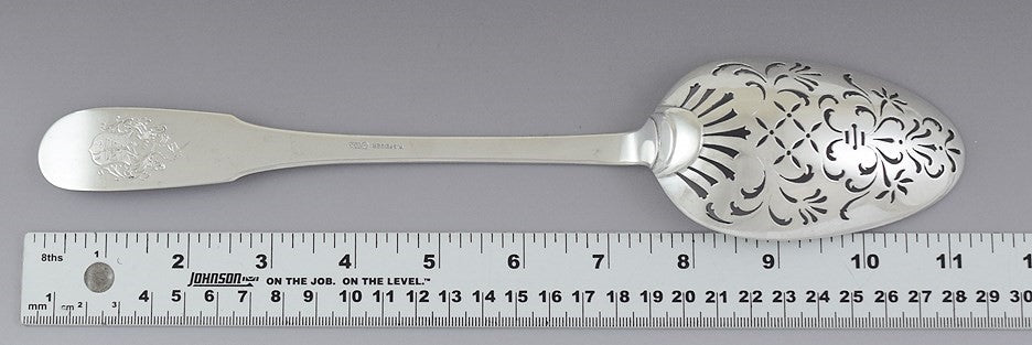 Presented is a wonderful European 800 purity silver pierced serving spoon, dating to around 1890-1925. We believe this piece was made in Switzerland or surrounding areas, but we aren't sure. The bowl of the spoon is decoratively pierced in an intricate, eye-catching design, while the handle is done in a classical round-tipped pattern. The handle is finely engraved on both sides with armorial crests, on one side a griffin rampant in a scroll-edged shield and on the other side a shield topped by a demi-unicorn rampant.