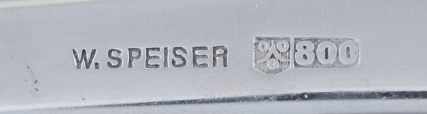 The spoon is stamped 800 for the purity of the silver, as well as what is likely a maker or retailer's mark of W. Speiser and a shield shaped stamp that is likely a city mark.