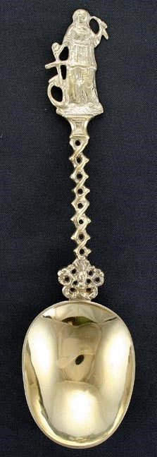Presented is a fine continental European silver figural spoon. The handle of the spoon is topped with a man in Renaissance style dress holding an anchor or a sword. The entire spoon is covered with a nice gold wash. The spoon was made in the late 1800s or early 1900s, probably in the Netherlands or Germany, certainly from continental Europe.