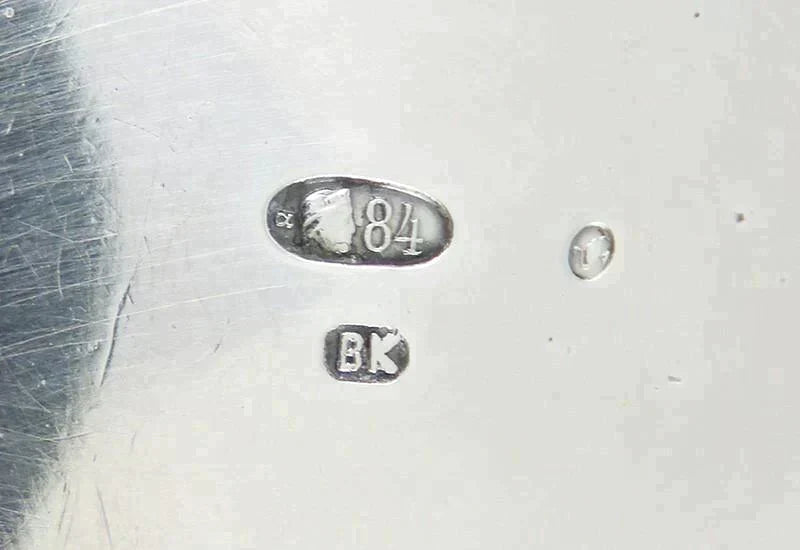 The underside bears the Russian Kokoshnik 84 mark for 875 purity silver and a maker's mark. There is a small French import mark along the bottom rim.