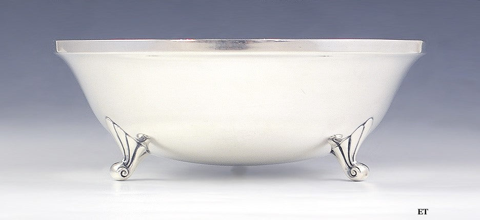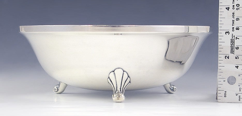 Presented is a fantastic sterling silver bowl by Tuttle. This piece dates between about 1890 to no later than 1923. The bowl rests on three scrolled feet, which join to the body with an elegant shell design. The bowl is polished to a bright finish, very clean and simple. The bowl is well made, and would be great as a centerpiece or fruit bowl, or however else you want to use it.
