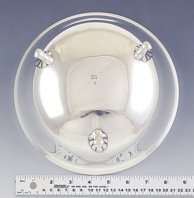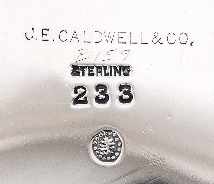 The underside of the bowl is stamped with the maker's mark for Tuttle as well as sterling and the retail mark for J.E. Caldwell & Co. Tuttle instituted their date marking system during the presidency of Calvin Coolidge, beginning in 1923. This bowl does not have a date mark, indicating that it dates some time between the start of the company and 1923.