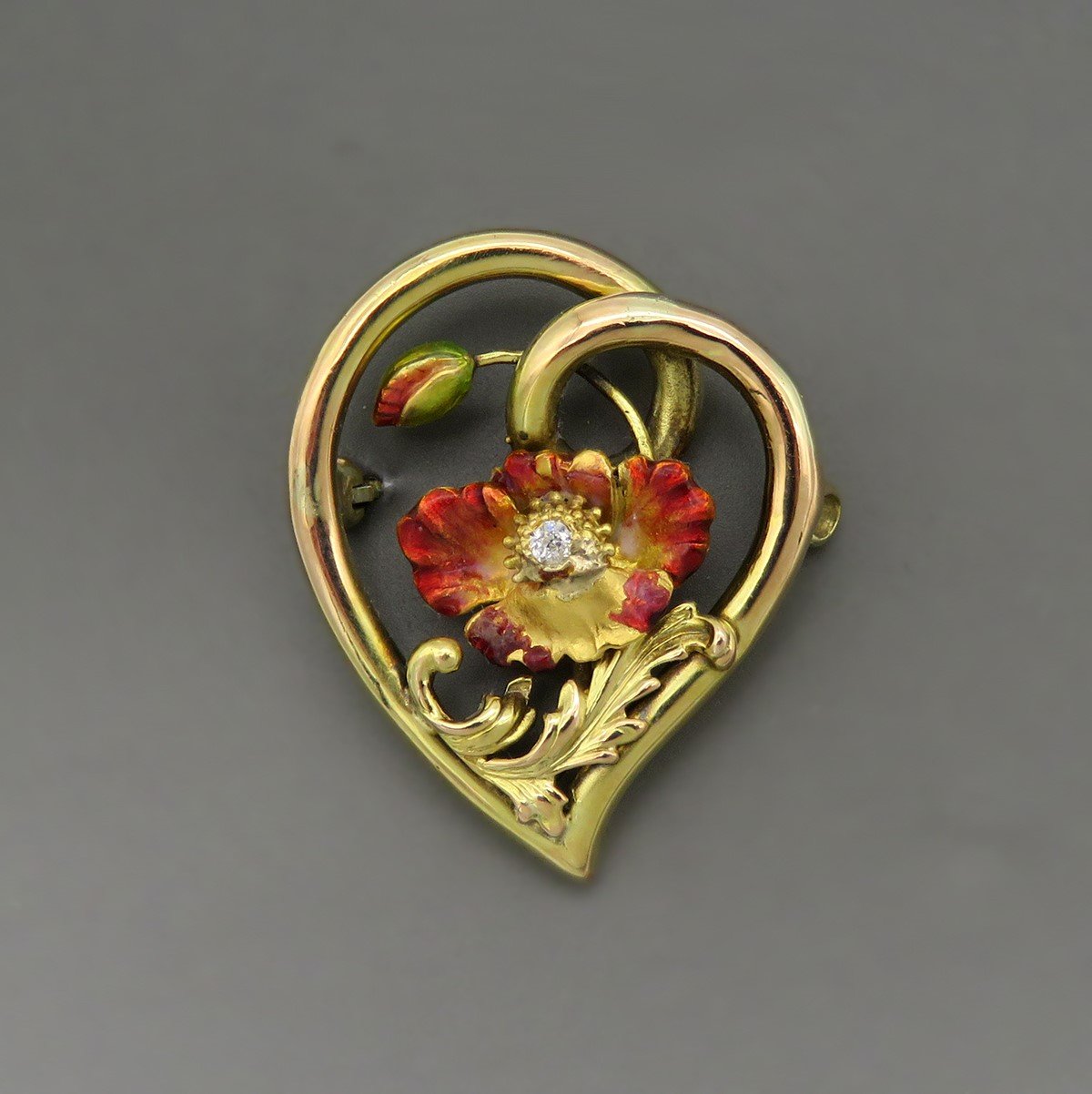 Presented is an antique 14 karat yellow gold, diamond and enamel pin or small brooch made in America during the late 1800s or very early 1900s. This piece was made in America, most likely in New Jersey or New York during the 1890s. This Art Nouveau piece is done in an open heart form, featuring a very realistically rendered flower in red enamel that is set in the center with a sparkling old mine cut diamond, with another red and green flower bud behind and a leaf flourish beneath. The flower, the bud, and the leaf are all very finely textured and detailed, making this a very attractive piece.