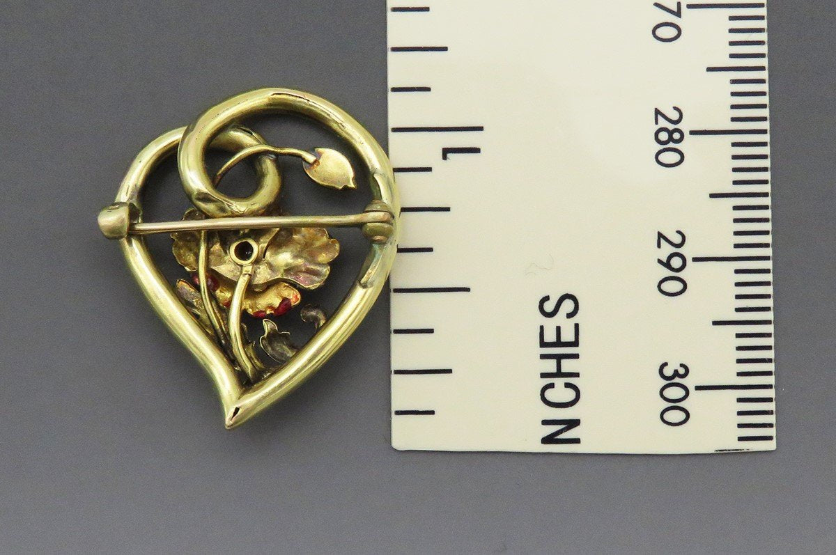 Antique c1890s 14K Yellow Gold Diamond Red Enamel Flower Heart Pin Brooch