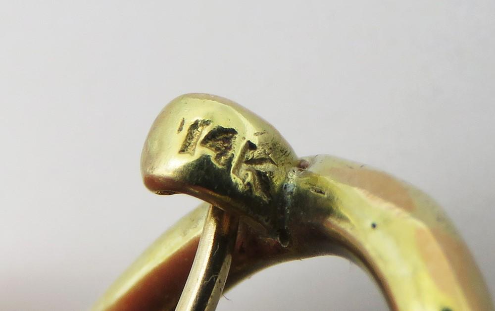 The clasp is stamped 14K. This piece has been nitric acid tested and is guaranteed to be 14 karat gold purity. The pin is in great condition, considering its age. There is some loss to the enamel, as you can see in the photographs, and few very tiny dings along the heart shaped frame, but these flaws are only visible upon very close inspection of the piece. The flower could be re-enameled or painted to make this loss of color less noticeable, as well.