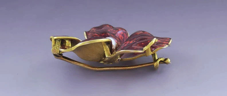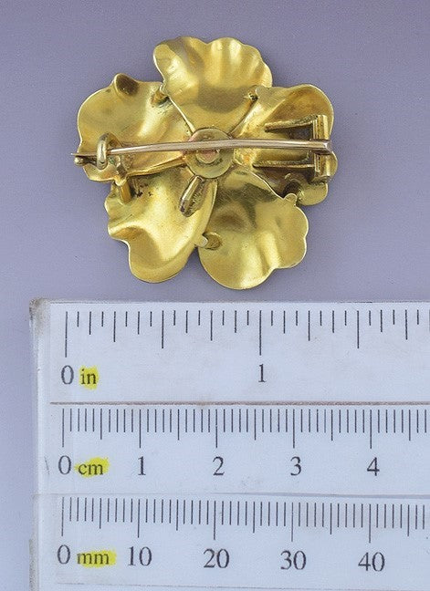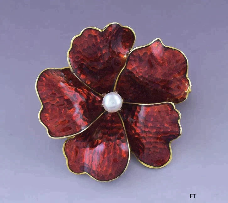 Antique c1890s 18K Yellow Gold Red Enamel Pearl Hibiscus Flower Pin Brooch