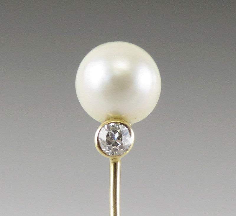 Presented is an antique, 14 karat yellow gold, natural salt water (not cultured) button pearl and diamond stickpin made in America during the late 1800s or early 1900s. The decorative top is post set with a natural pearl and bezel set with a mine cut diamond. The diamond is approximately 14 to 15 points in size. The pearl is 7.8 mm. We have included a gold colored stopper.