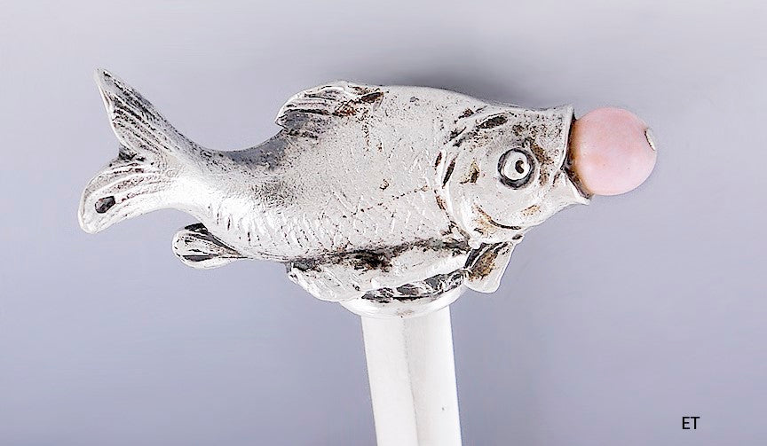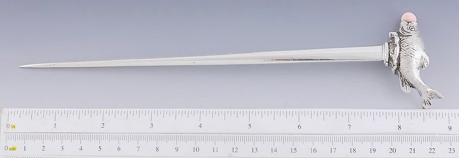 Presented is an interesting Austrian silver skewer with a fish figural topper. This piece dates to around the turn of the century. The fish is solidly cast from silver, very detailed and realistic. The fish has in its mouth a ball of what looks like pink coral, or possibly ceramic.