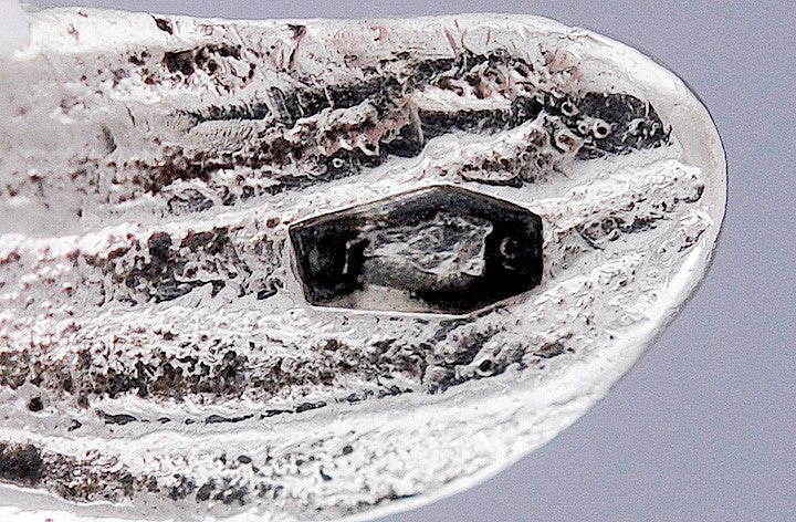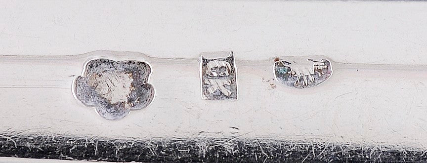 The 'blade' of the skewer is hallmarked with the Austrian Diana's head stamp for 800 purity silver, as used circa 1867-1922. There is also a maker's mark, partially worn, that ends in -CK, and what is probably a city mark. The tail of the fish is marked with the dog's head small article mark for 800 purity silver.