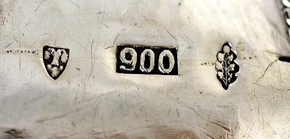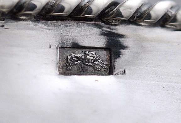 The piece is marked on the lower portion of one arm with 900 for the silver purity, a shield-shaped mark, and a compound leaf mark. The leaf mark resembles a small articles mark used in Belgium between 1814 and 1831, but we are not sure if this is the Belgium mark. It is also marked on the upper rim with a French import mark.