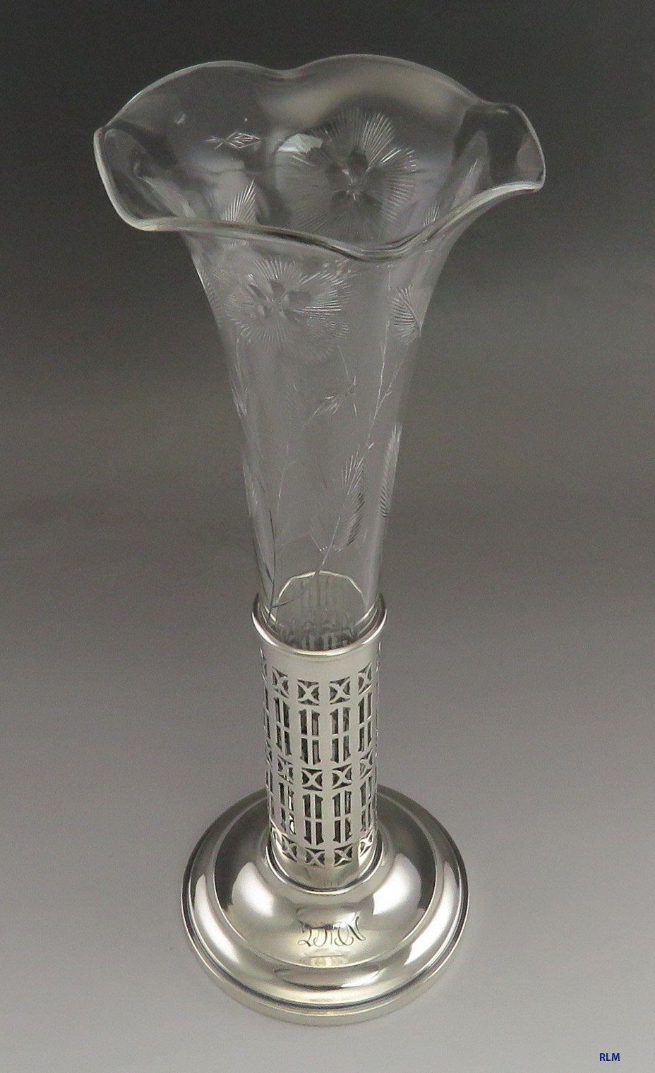 Presented is an antique, sterling silver and American Brilliant cut glass trumpet form flower vase made by Mauser during the late 1800s or very early 1900s. The base is solid sterling silver, pierced with nice designs and has an old monogram of the initials DMN. The glass insert is beautifully cut with flower decorations and has a ruffled rim.