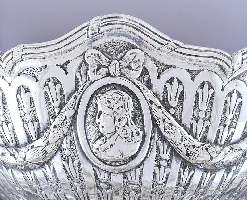 Presented is a fine pair of German silver double ended sauce or gravy boats, with underplates. These dishes date to the late 1800s or early 1900s. The dishes are beautifully hand chased with swags, bellflowers, and medallions featuring men in profile wearing period garb, possibly monarchs. The dishes have underplates that are attached with bolts, so they can be removed for ease of cleaning. The interiors have the remnants of a gold wash. Although these are classic sauce boats, the dishes are quite versatile and could be used to serve a variety of foods.