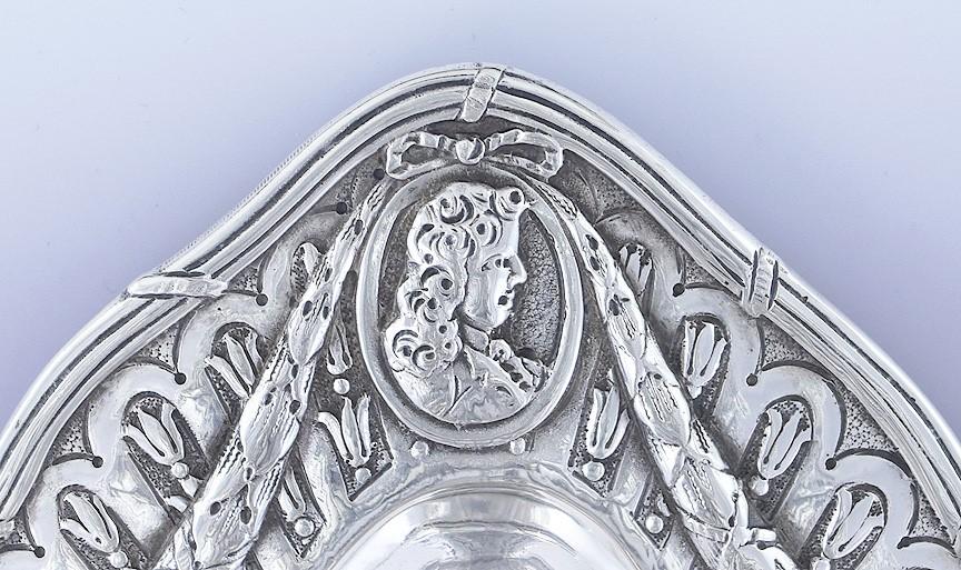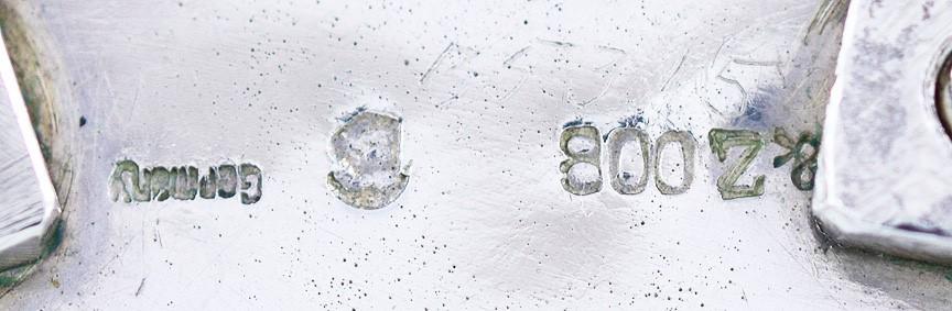 One dish is stamped on the underside with the German crescent and crown mark as well as 'Germany,' 800 for the purity of the silver, and a maker's mark we unfortunately do not recognize. The other dish has the same marks, but they are stamped on the upper side of the base instead of the underside.