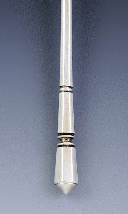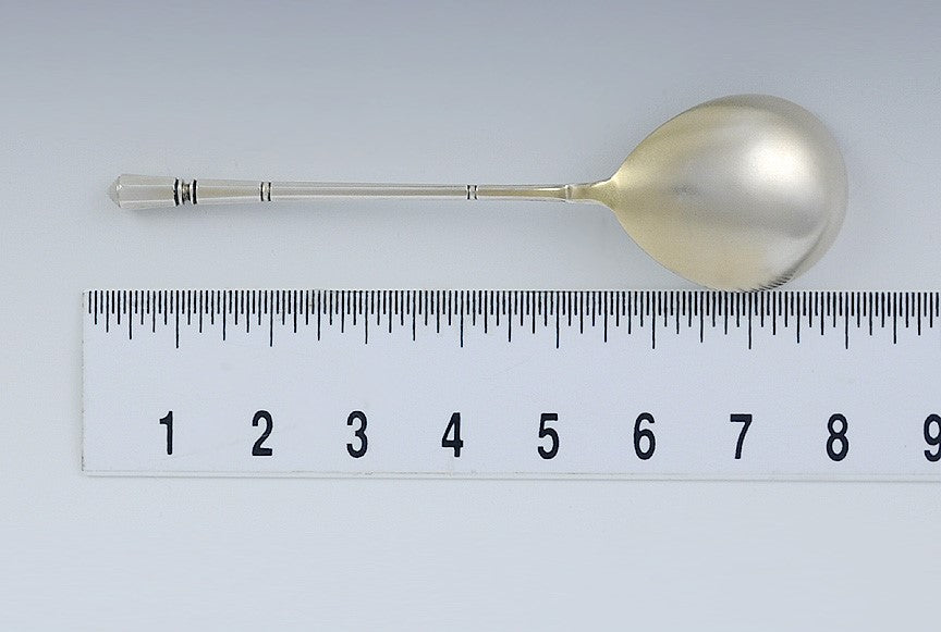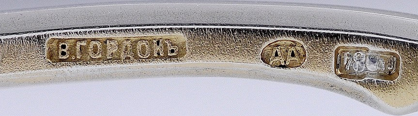 The side of the handle is marked with the Russian zolotniki symbol of 84 for 84/96 parts silver or .875 purity silver and a maker’s mark written in Cyrillic for V. Gordon.