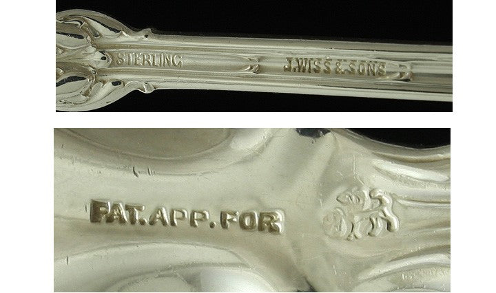 The spoon is marked on the reverse with a maker’s mark for Whiting, Sterling, Pat. App. For., and J. Wiss & Sons for the retailer.