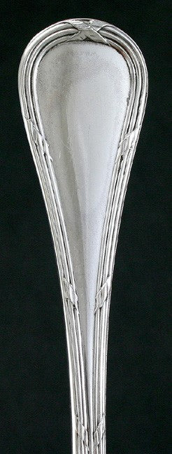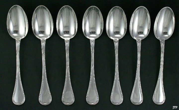 Presented is a fine quality set of 7 French silver large tablespoons or serving spoons by the fine quality Paris silversmiths, Olier & Caron. This highly regarded firm was active in the early 1900s, perhaps even in the 1800s. The spoons are done in an elegant threaded pattern with ribbon decoration around the handles. I see this pattern produced by many of the finer French and European makers.