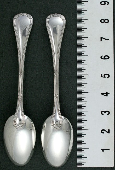The condition is excellent. The spoons have some surface wear commensurate with age and light use, but this is minor. There are no dents, no dings, no splits, no monograms, no monogram removals, no breaks, and no repairs.