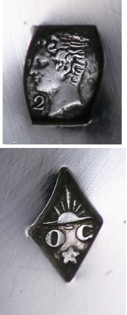 The spoons are hallmarked on the bowls with the Mercury mark for French 800 purity silver and a maker’s mark of OC for Olier and Caron.