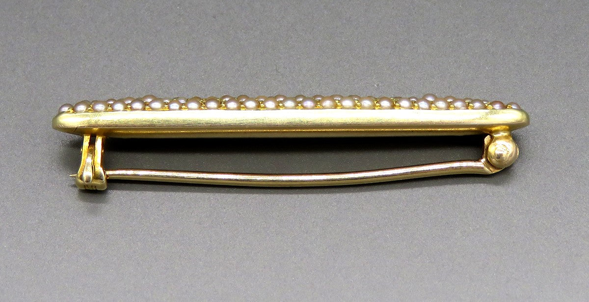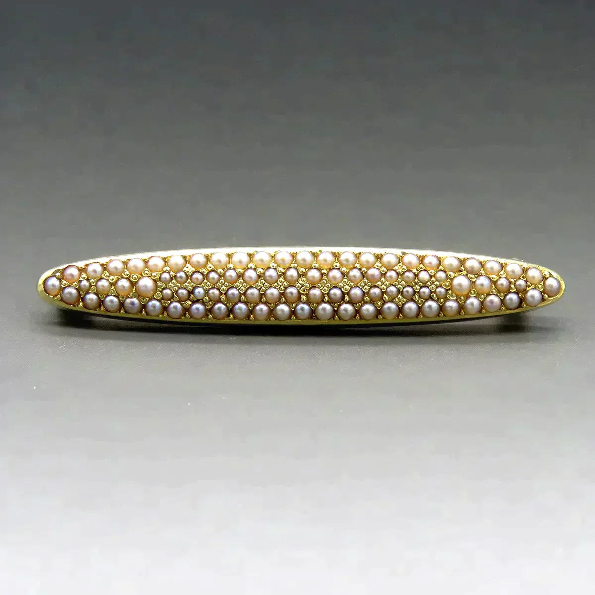 Antique c1910 Edwardian 14K Yellow Gold Natural Seed Pearl Bar Pin Brooch