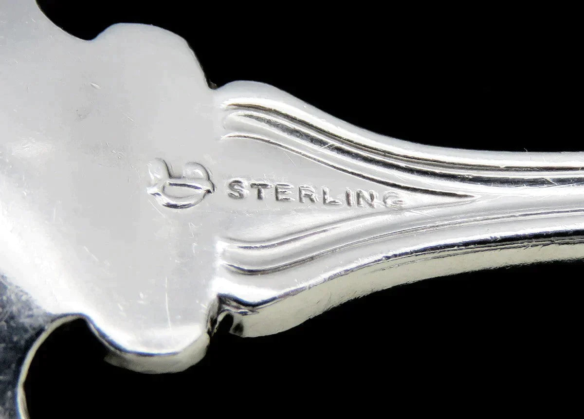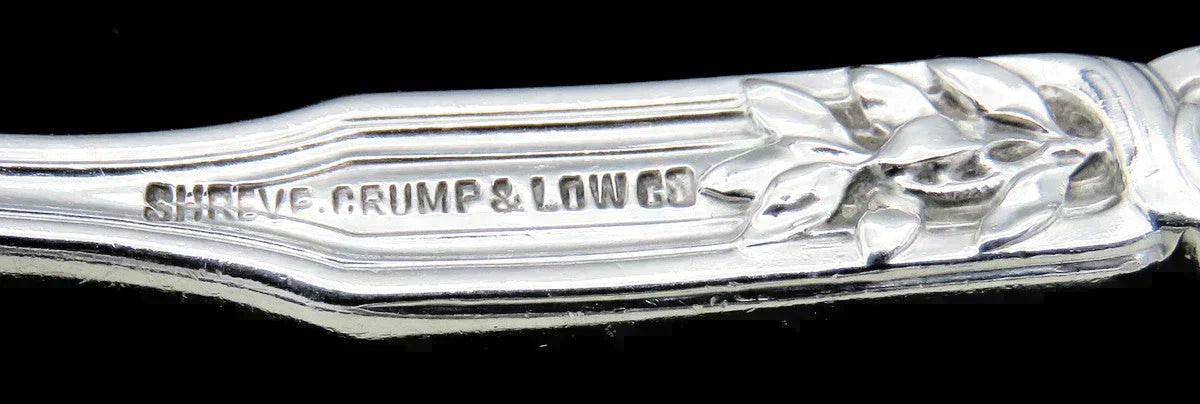 The back of the handle is marked for Durgin, sterling silver purity and has a retailer's mark for Shreve, Crump & Low.
