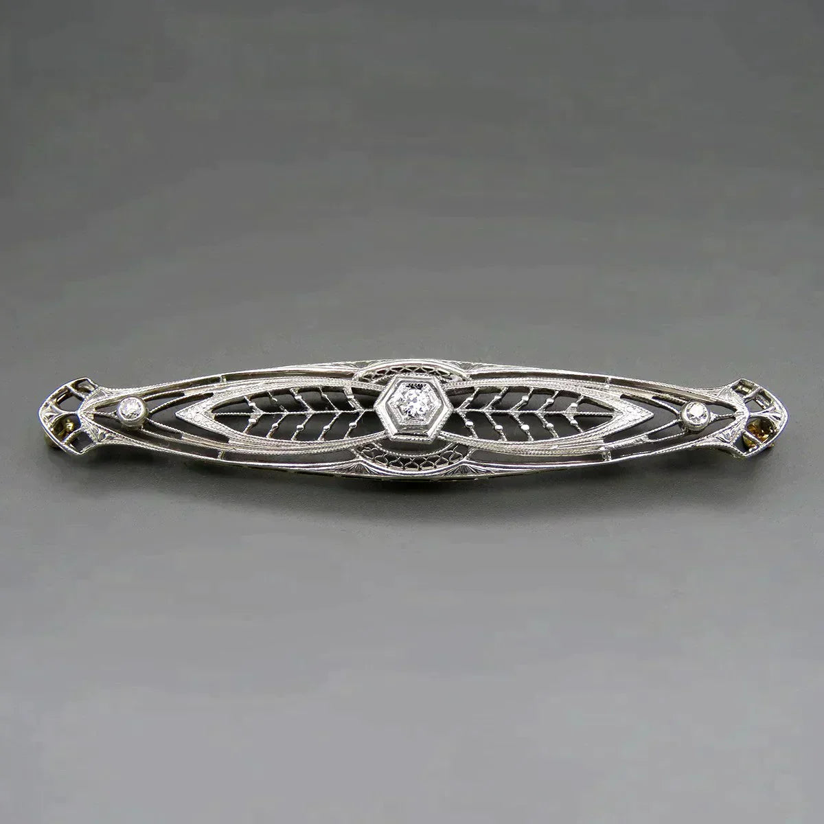Antique c1915 14K Gold Platinum Top 3 Diamond Filigree Bar Pin