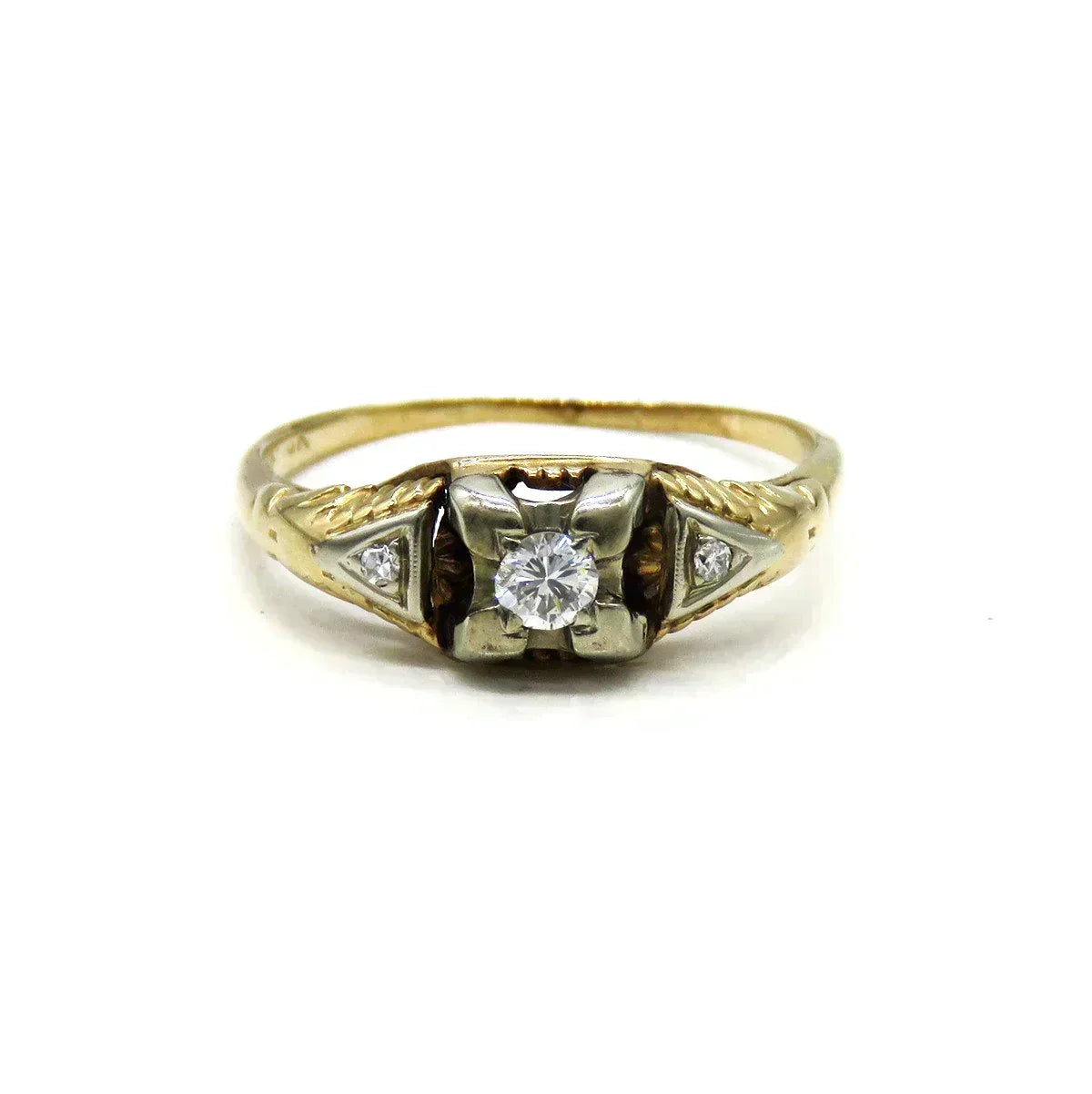 Presented is an antique, 14 karat yellow gold and natural diamond gemstone engagement ring made in America between the 1910s and the 1930s. The band is yellow gold and the 3 diamonds are set in 18k white gold. The decorative top is engraved. This piece can be resized by a professional jeweler.