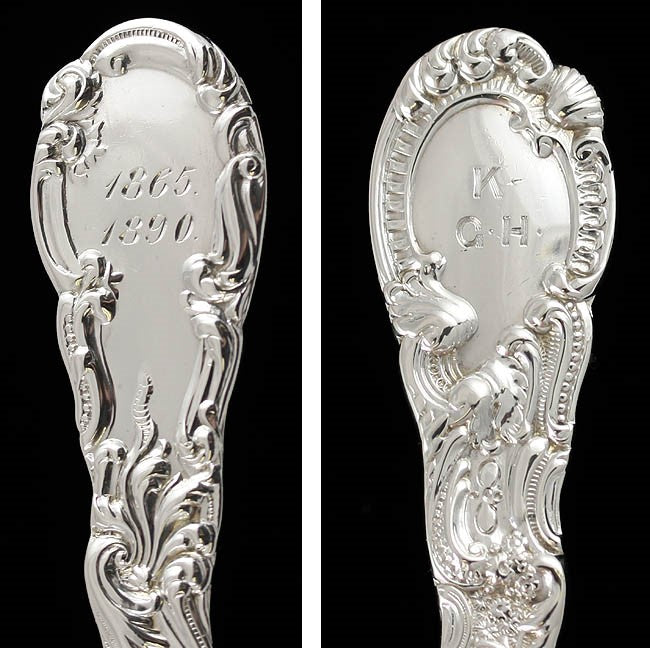 Presented is a wonderful old sterling silver ice cream slice made by William B. Durgin Company. The ice cream server is done in the Louis XV pattern which was first produced in 1890. The handle is nicely engraved with a twenty-fifth anniversary presentation including the initials K over GH on the front of the handle and the dates 1865 and 1890 on the reverse. This piece was obviously given in 1890, the first year that this pattern was produced.