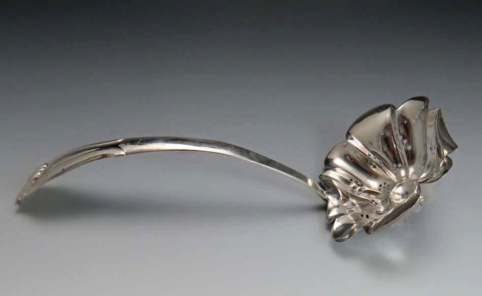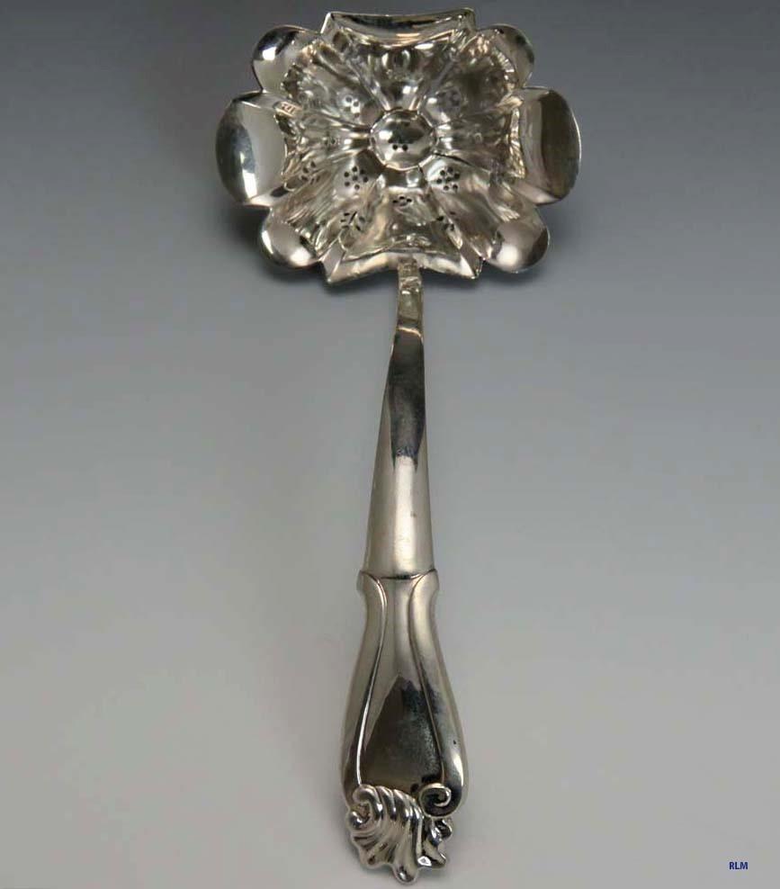 Presented is a nice antique Dutch 833 purity silver pierced berry ladle. The ladle is done in a classical Dutch pattern. The bowl or business end of the ladle is pierced to drain sauce. The bowl is made in the shape of a flower. This piece is light weight. Let the photos be your guide.