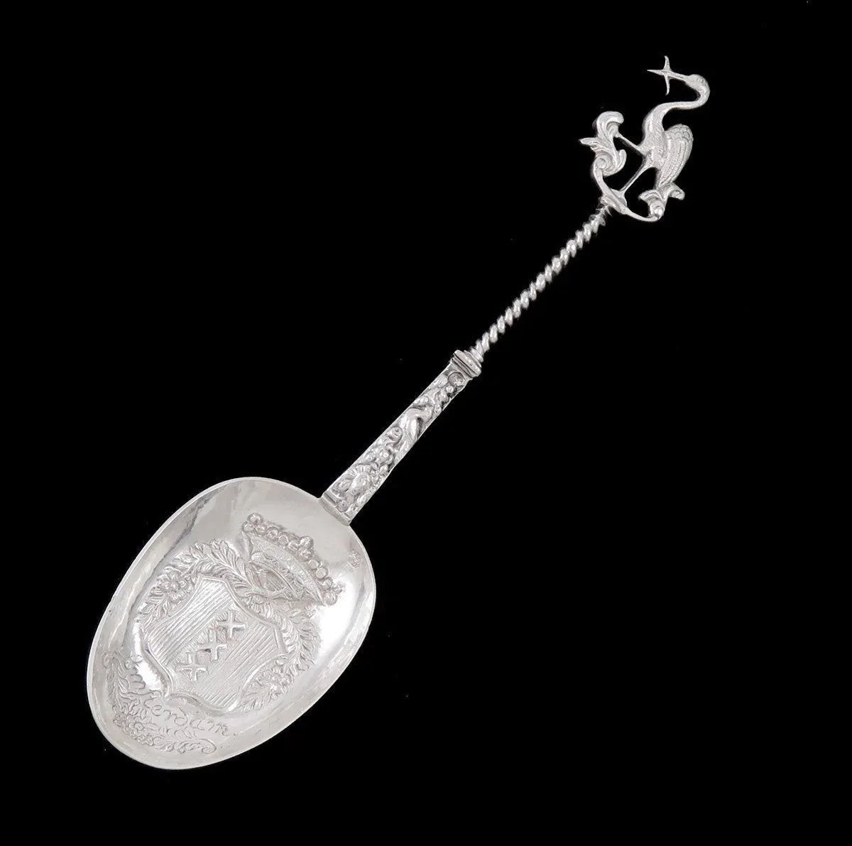 Presented is an antique, Dutch silver serving spoon or souvenir/novelty spoon for the city of Amsterdam made in 1899. The chased and twisted shafted handle is topped with a detailed finial of a sea bird with a fish in its mouth. The bird appears to be a heron, crane, egret or possibly a stork. The bowl has a repousse chased crest of the city of Amsterdam.