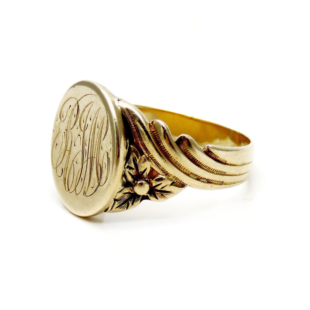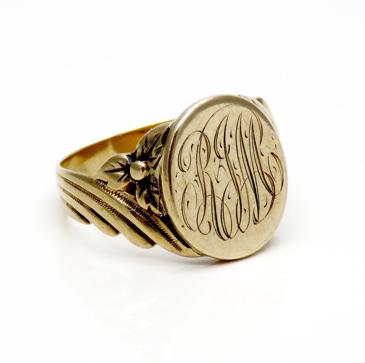 Presented is a wonderful antique 14 karat yellow gold signet ring. This ring dates to the early 1900s and was made in America. The head of the ring is round, with a finely engraved monogram of RJM, done in flowing script. The gold is quite thick, so this monogram could be removed by a professional jeweler, and replaced with your own initials, crest, seal, or whatever else you like. The shoulders of the ring have an elegant spiral design, with a little trefoil on either side, nicely detailed with hand engraved elements. The ring is quite well made and has a nice feeling of weight and quality to it.