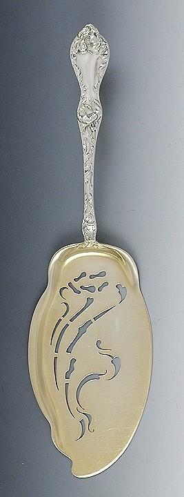 Presented is a fine American sterling silver fish or pie server. This piece dates to the early 1900s. This server is done in Reed & Barton's beautiful Les Cinq Fleurs pattern. As the name would suggest this is a floral pattern, and the handle of this piece features raised designs of flowers and leaves, on the front and back. The blade of the server has an attractive gold wash, and has nice pierced Art Nouveau swirls. A well constructed and completely useable piece of American silver, all it needs is a home.