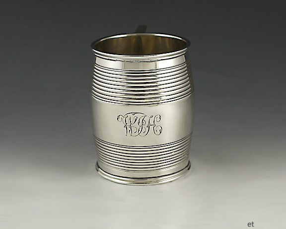 Presented is an old, sterling silver youth or child's mug or cup made in 1817 by Solomon Hougham, Solomon Royes & John East Dix of London. The cup is in an interesting barrel form and there is a lovely monogram on the front of the initials WJH.