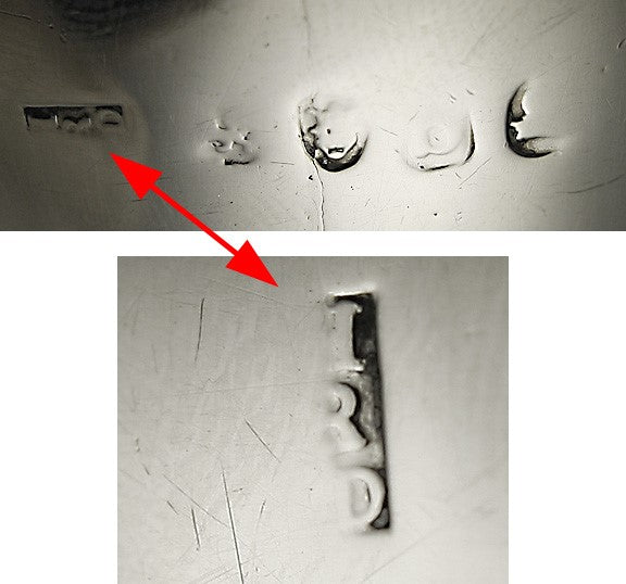 The side is marked with the crowned leopard’s head for London, the lion passant for sterling silver, a duty mark of King George III’s head, a date letter b for the year 1817 and a maker’s mark for Solomon Hougham, Solomon Royes & John East Dix.