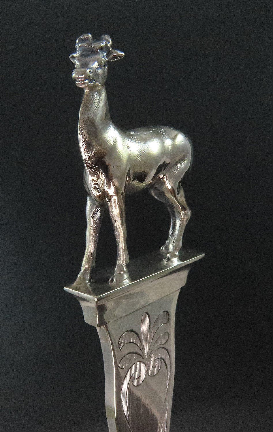 Presented is an antique English silver-plated letter opener or meat skewer made sometime between 1850 and 1870s. The front and back of the opener have a foliated cartouche. The top of the opener has a three-dimensional deer with small tines majestically standing. This piece is larger than a typical letter opener. Probably made by Barnard.