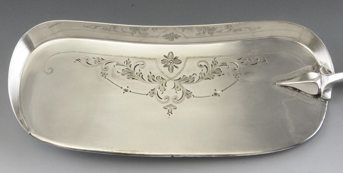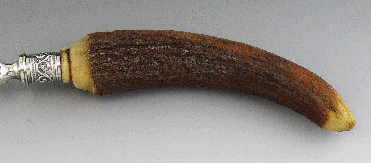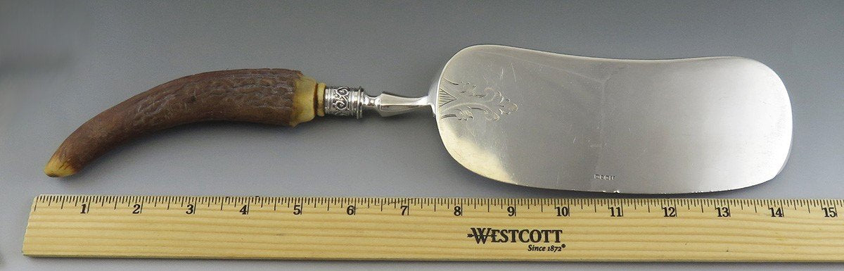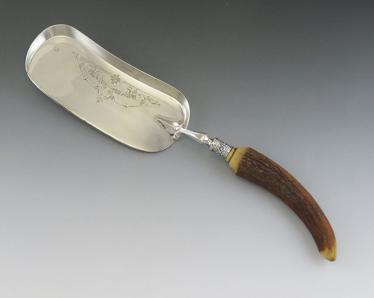 Antique English Silverplate Stag Handle Engraved Crumber Fish Slice Server