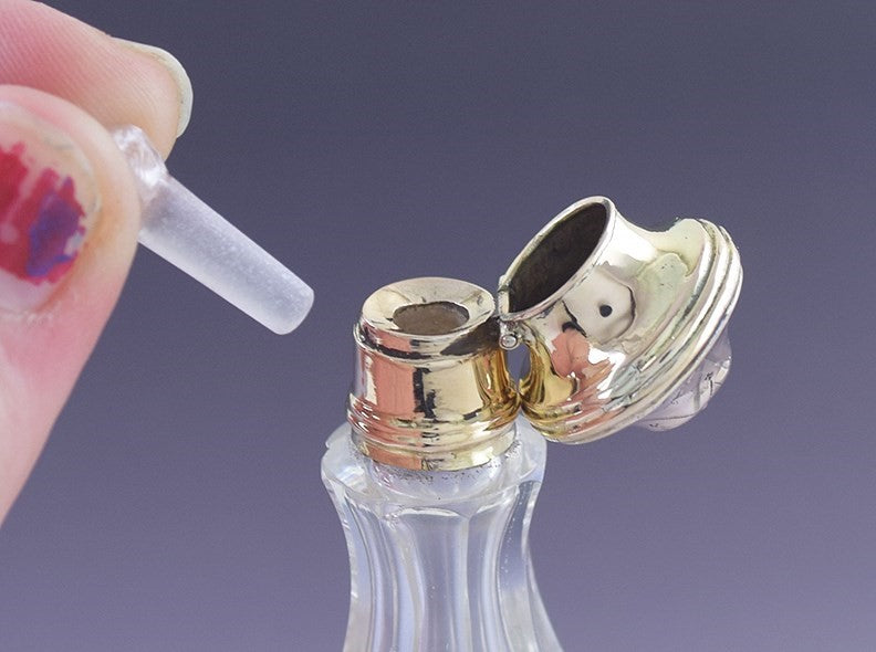 Presented is a lovely cut glass or crystal scent bottle, with a 14 karat gold lid. This piece dates to the late 1800s or early 1900s, and is of continental European origin, possibly Dutch. The lid is finely hand engraved with a large star, with smaller stars in between its arms. The lid is well constructed in a hinged design, opening to reveal a little glass stopper that doubles as an applicator/dauber for the perfume the bottle would hold. The glass is beautifully cut, done in an elegant paneled balustroid form.