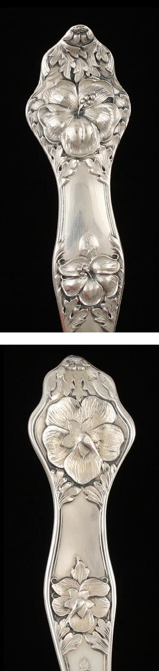 Presented is a beautiful sterling silver soup or punch ladle by Manchester Manufacturing Company. The ladle is in a floral pattern and was made at the turn of the century. The pattern on this ladle is beautiful, it depicts two large Hibiscus blossoms surrounded by leaves, there are also leaves at the base of the handle; in the bowl of the ladle there is a generic looking flower and leaves. The pattern name is Landers #2. The bowl is unique, with a fluting effect. The bowl has a light gold wash on the inside, some has worn away.