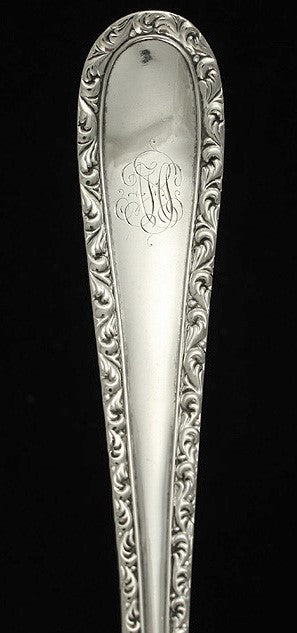 Presented is a fine quality, heavy weight sterling silver platter spoon or stuffing spoon made by Galt & Davis or Galt Brothers. The handle has a small border of swirls or curly cues around the edges. The spoon has a ball knob or foot rest on the back of the handle. This is a nice feature which prevents the spoon from falling into a large roasting pan or bowl. The end of the handle is monogrammed with AHS in an elegant script. The back of the handle is engraved with the date 1896. This piece obviously dates to 1896 or perhaps a few years earlier.