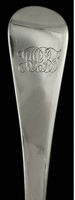 Presented is an antique, English sterling silver serving spoon, platter spoon or stuffing spoon made by Richard Crossley & George Smith IV of London in 1811. The spoon is in a classical form, with a round-tipped handle. The piece is engraved with a lovely monogram of the initials HPBF. This spoon is a good weight for its size.