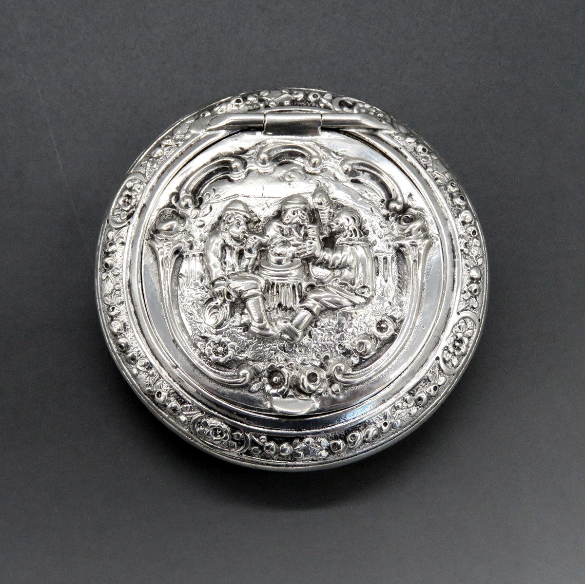 Presented is an antique, German silver makeup compact for powder or talc made during the late 1800s or early 1900s. The round compact depicts a detailed tavern scene of 3 men around a table. The inside of the compact has a gold wash.