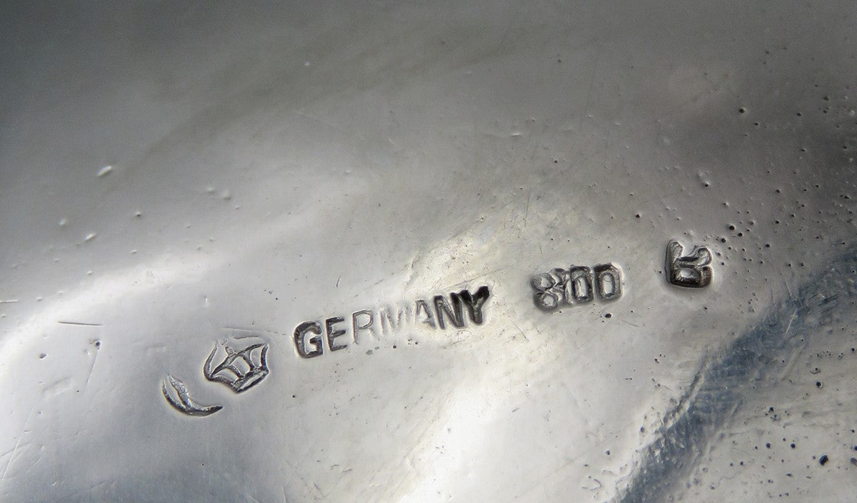 The back bears the German crown and crescent moon hallmark for Germany, 800 for the silver purity and a maker's mark.