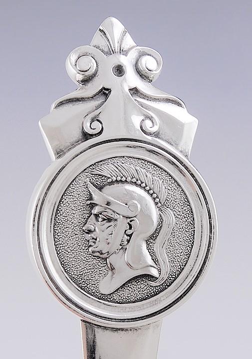 Presented is a fine old Gorham sterling silver pierced serving scoop or ladle. This piece is done in the Medallion pattern, which began production in 1864. As the name suggests, this pattern features a medallion design for the end of the handle, with a classical Greco-Roman style profile in the center of the medallion. This particular piece has a helmeted soldier's profile, very well done down to the detail of the plume on his helmet. The bowl of the ladle is pierced and gilded, suitable for serving berries or other fruit in syrup, or whatever other serving purpose you like. The back of the handle has a monogram of HFH.